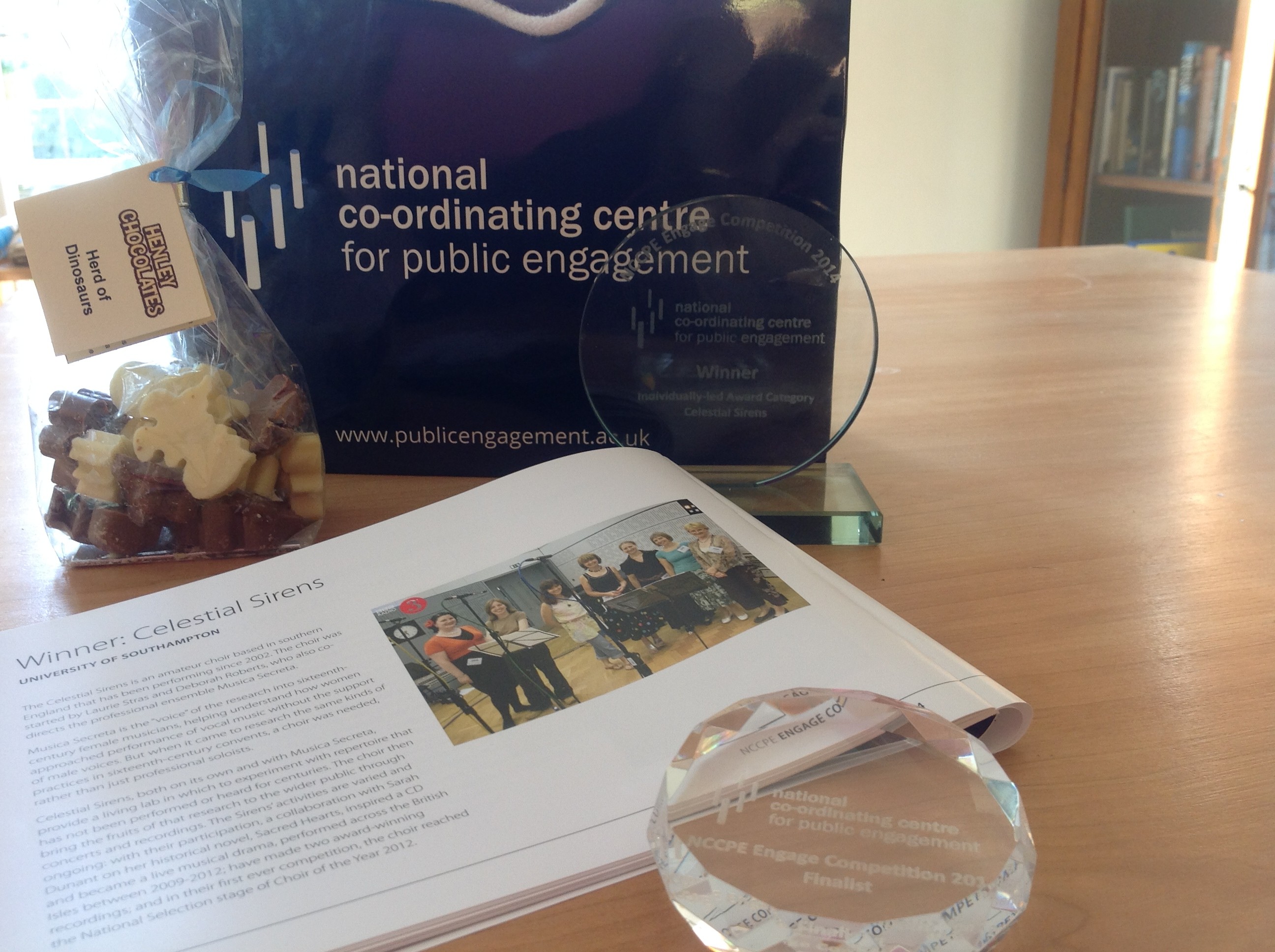 Yesterday the winners of the Engage Competition (run by the National Coordinating Centre for Public Engagement) were announced at an awards ceremony at the Natural History Museum. Laurie won the Individually-led Project category with Celestial Sirens! We are so very proud of, and grateful to, every one of the Sirens, past and present. The award is a wonderful recognition of the investment that the choir has made in working together with us. There is still a great deal of work to do, and music to be sung, and we are all eager to get started on new recording projects this summer.